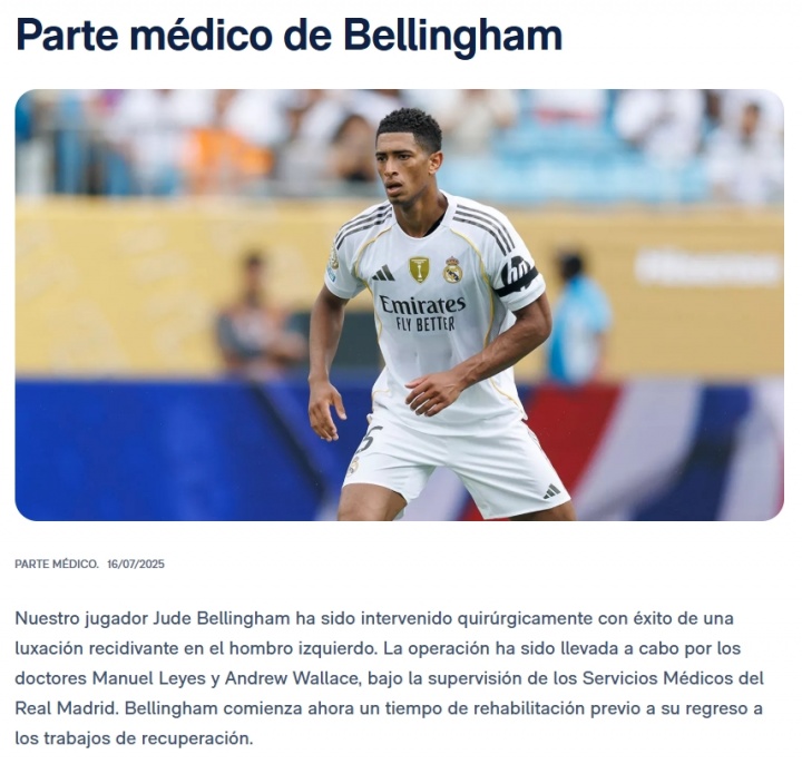 07月16日讯 皇马官方消息,球队中场贝林厄姆今天成功接受左肩复发性脱臼手术。据报道,贝林厄姆预计10-12周之后复出。
