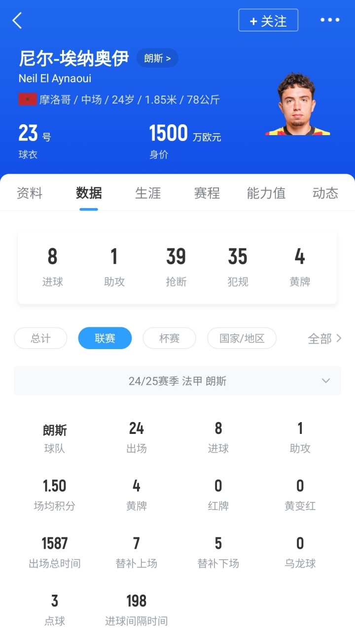 埃纳奥伊,现年24岁,摩洛哥中场,上赛季代表朗斯在联赛中出战24场比赛,贡献8球1助,球员德转身价1500万欧。